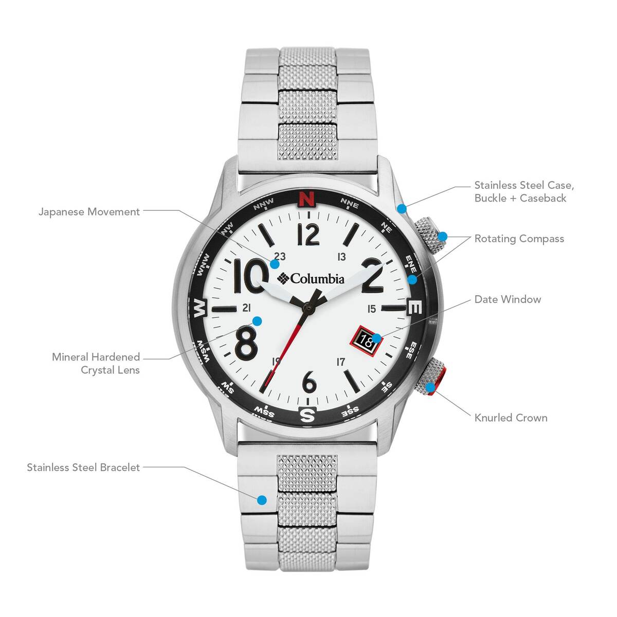 Kasa Çapı: 42 mm - Kasa Şekli: Yuvarlak - Kasa Materyali: Çelik - Kasa Rengi: Metalik Gri - Kordon Materyali: Çelik - Kordon Rengi: Metalik Gri- Kadran Rengi: Beyaz - Kadran Işığı: Yok - Taş: Yok - Çalışma Şekli: Analog - Teknolojisi: Quartz - Takvim: Var - Kronometre: Yok - Alarm: Yok - Cam Özelliği: Mineral - Özellik: Pusula - Su Geçirmezlik: 5 ATM - Garanti Süresi: 2 yıl - Cinsiyet: Erkek