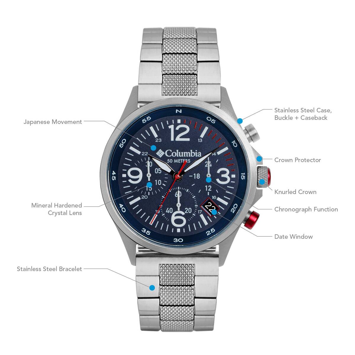 Kasa Çapı: 42 mm - Kasa Şekli: Yuvarlak - Kasa Materyali: Çelik - Kasa Rengi: Metalik Gri - Kordon Materyali: Çelik - Kordon Rengi: Metalik Gri- Kadran Rengi: Mavi - Kadran Işığı: Yok - Taş: Yok - Çalışma Şekli: Analog - Teknolojisi: Quartz - Takvim: Var - Kronometre: Var - Alarm: Yok - Cam Özelliği: Mineral - Özellik: AM/PM Göstergesi - Su Geçirmezlik: 5 ATM - Garanti Süresi: 2 yıl - Cinsiyet: Erkek