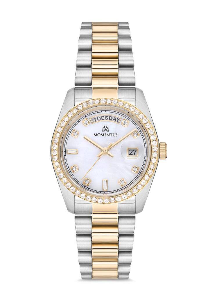 Kasa Çapı: 34.5 mm - Kasa Şekli: Yuvarlak - Kasa Materyali: Paslanmaz Çelik - Kasa Rengi: Çelik - Gold - Kordon Materyali: Paslanmaz Çelik - Kordon Rengi: Çelik - Gold- Kadran Rengi: Sedefli - Beyaz - Kasa Kalınlık: 10.1 mm - Kordon Genişliği: 19 mm - Kordon Kilit: Kilitli Klips - Teknolojisi: Quartz - Takvim: Tarih & Gün - Kronometre: Yok - Cam Şekli: Kesme - Cam Özelliği: Mineral - Koleksiyon: ShinyStar Collection - Su Geçirmezlik: 3 ATM - Garanti Süresi: 2 Yıl - Cinsiyet: Kadın